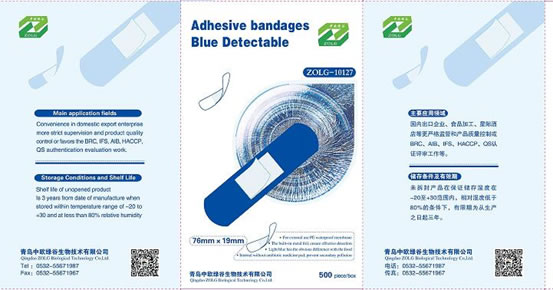 BRC(BRC-ATP)藍(lán)色創(chuàng)可貼。(按照BRC/IFS/AIB及采購(gòu)商二方審核的要求,購(gòu)買的藍(lán)色金屬可探測(cè)的創(chuàng)可貼)定向供給歐盟出口轉(zhuǎn)內(nèi)銷產(chǎn)品 Directional supply European exports turns sale in domestic market products青島綠谷公司方便于國(guó)內(nèi)出口企業(yè)更嚴(yán)格監(jiān)管和產(chǎn)品質(zhì)量控制或利于BRC、AIB、IFS、HACCP、QS認(rèn)證評(píng)審工作等Convenience in domestic export enterprise more strict supervision and product quality control or favors the BRC, IFS, AIB, HACCP, QS authentication evaluation work. Main application fields(領(lǐng)域):食品出口加工企業(yè)、醫(yī)療衛(wèi)生特殊行業(yè)等。青島綠谷公司提示,本產(chǎn)品非藥物創(chuàng)可貼